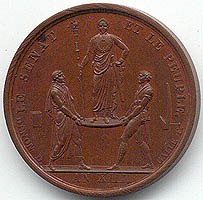 This is one of the few medals from Napoleon's medal mint which credit the artist who drew the sketch copied by the engraver. Presumably in most cases Denon told the artist what he wanted and felt that an artist following his instructions didn't deserve any credit. In addition to the banquet celebrated by this medal, the City gave the newly-crowned Emperor an imperial silver service, gilt, containing over 500 pieces, weighing two hundred twenty five pounds. Made by the goldsmith Henri Auguste and others, the service was melted down by Charles X except for twenty two pieces which may be seen today at Malmaison, once the country house of Josephine and Napoleon.